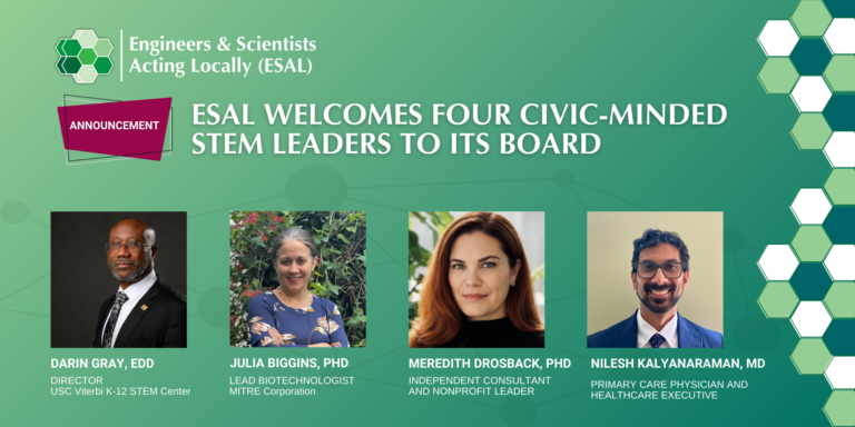 Engineers & Scientists Acting Locally (ESAL) is expanding its board with four leaders who exemplify what civic-minded STEM leadership looks like in action. Darin Gray, EdD, Julia Biggins, PhD, Meredith Drosback, PhD, and Nilesh Kalyanaraman, MD, FACP, bring a wide range of experience spanning STEM education, infectious disease and biodefense, science policy and communication, and public health and community leadership.