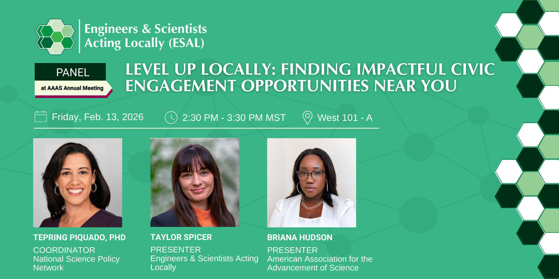 Scientists often want to make a local impact but are not sure where to start. This workshop will introduce participants to local government structures and generally how to engage with them. Participants will learn about boards and commissions, task forces and advocacy groups where STEM expertise is needed. Participants will learn a step-by-step approach to finding and pursuing local opportunities aligned with their interests. In small groups, they’ll practice researching opportunities in their communities, communicating their value to organizations, and setting personal engagement goals and strategies. Participants will leave with a personalized action plan and a downloadable guide with resources to sustain their civic engagement journey.