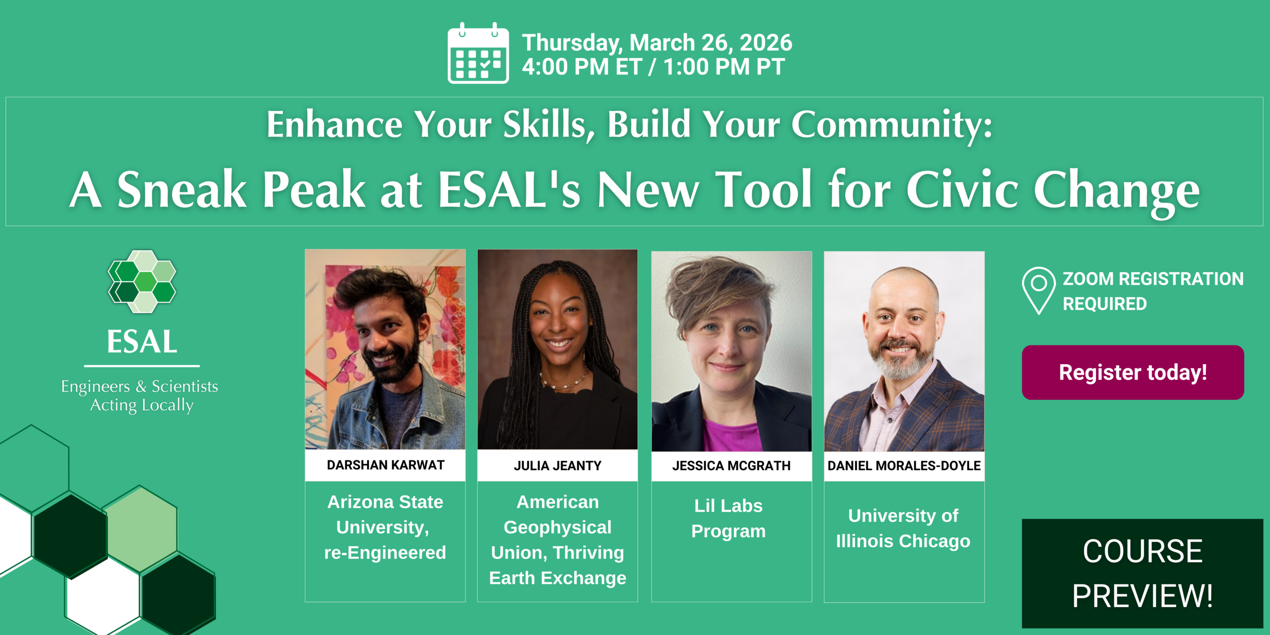 Engineers and Scientists Acting Locally is launching an on-demand course in April: The Local Civic Engagement Toolkit, designed for engineers and scientists who care about their communities and want clearer, more practical ways to get involved.