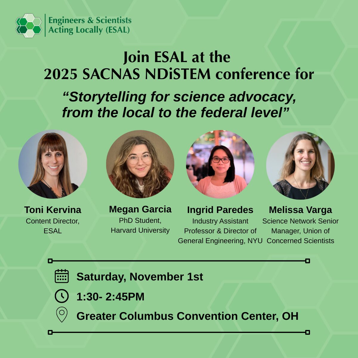 Together, ESAL, the Union of Concerned Scientists, and featured panelists will explore the components of crafting an effective public narrative for policy advocacy. Participants will hear directly from scientists and science communicators who have effectively woven stories into their policy engagement efforts. Workshop facilitators will share prompts and questions that participants can use to shape and adapt their own stories depending on their audience. There will be time for individuals to work on their narrative and share with others to get feedback. Workshop presenters will share ways for participants to bring their narrative into upcoming science policy opportunities, including ways they can get involved with the Union of Concerned Scientists and Engineers and Scientists Acting Locally.