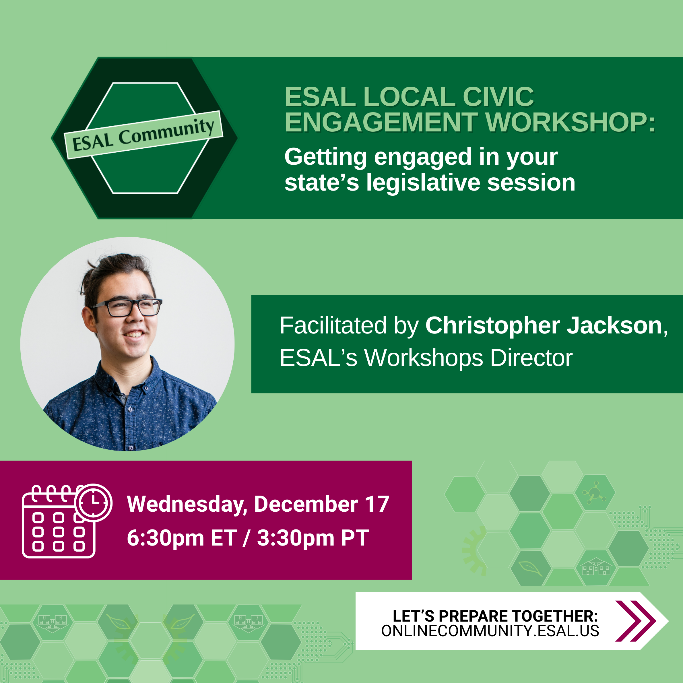 We’re excited to announce that Christopher Jackson, ESAL’s Workshops Director, will be facilitating a free, virtual workshop to help ESAL Community members get ready for the 2026 state legislative season.