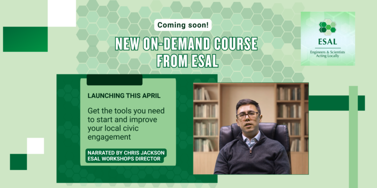 The team at Engineers and Scientists Acting Locally (ESAL) has developed a brand new offering, launching publicly this April. We will be hosting our first ever course on local civic engagement, available on-demand. Designed for learners with STEM backgrounds, this comprehensive course provides instruction on civic actions learners can take locally and provides them the tools they need to get started.